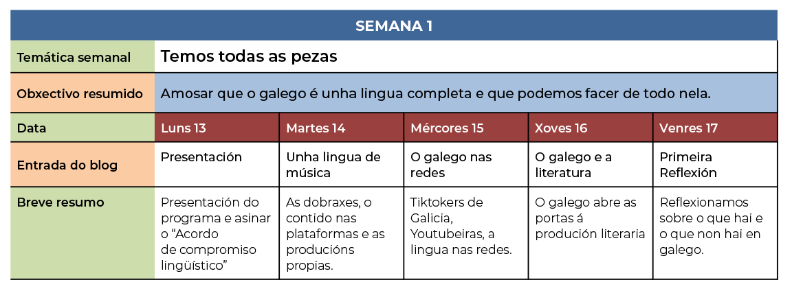 Temos todas as pezas! é o tema da primeira semana. O obxectivo destes días é amosarlle ao alumnado que o galego é unha lingua completa e que pode asumir calquera función. As actividades estarán orientadas a explorar todo do que dispoñemos nesta lingua, reflexionar sobre o que non hai e xerar os nosos propios contidos.